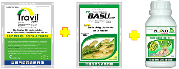 Kết luận: Khi lúa bị bội nhiễm đạo ôn và vi khuẩn tấn công, giải pháp là: Biện pháp kỹ thuật; rút nước trong ruộng bỏ, rải vôi sát khuẩn và phun thuốc đặc trị đạo ôn Travil 75WP + Thuốc đặc trị khuẩn TT Basu 250WP + Thuốc tăng cường sức sống Plastimula 1SL, sau 1 ngày vô nước mới. 5 ngày sau phun lặp lại lần 2. Sau 10 ngày quan sát ruộng sẽ hồi phục.