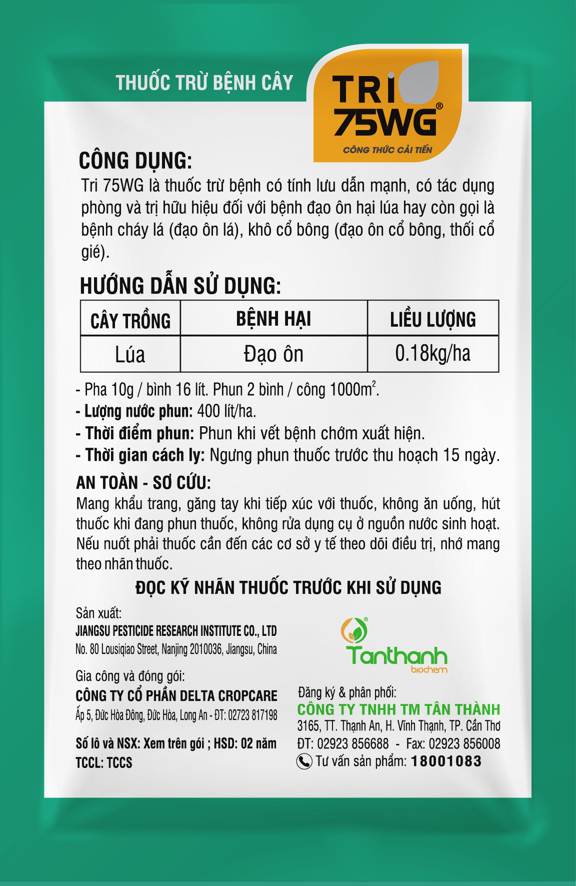 Tri 75 WDG là thuốc trừ bệnh có tính lưu dẫn mạnh, có tác dụng phòng và trị hữu hiệu đối với bệnh đạo ôn hại lúa hay còn gọi là bệnh cháy lá (đạo ôn lá), khô cổ bông (đạo ôn cổ bông, thối cổ gié), khô vằn trên lúa
